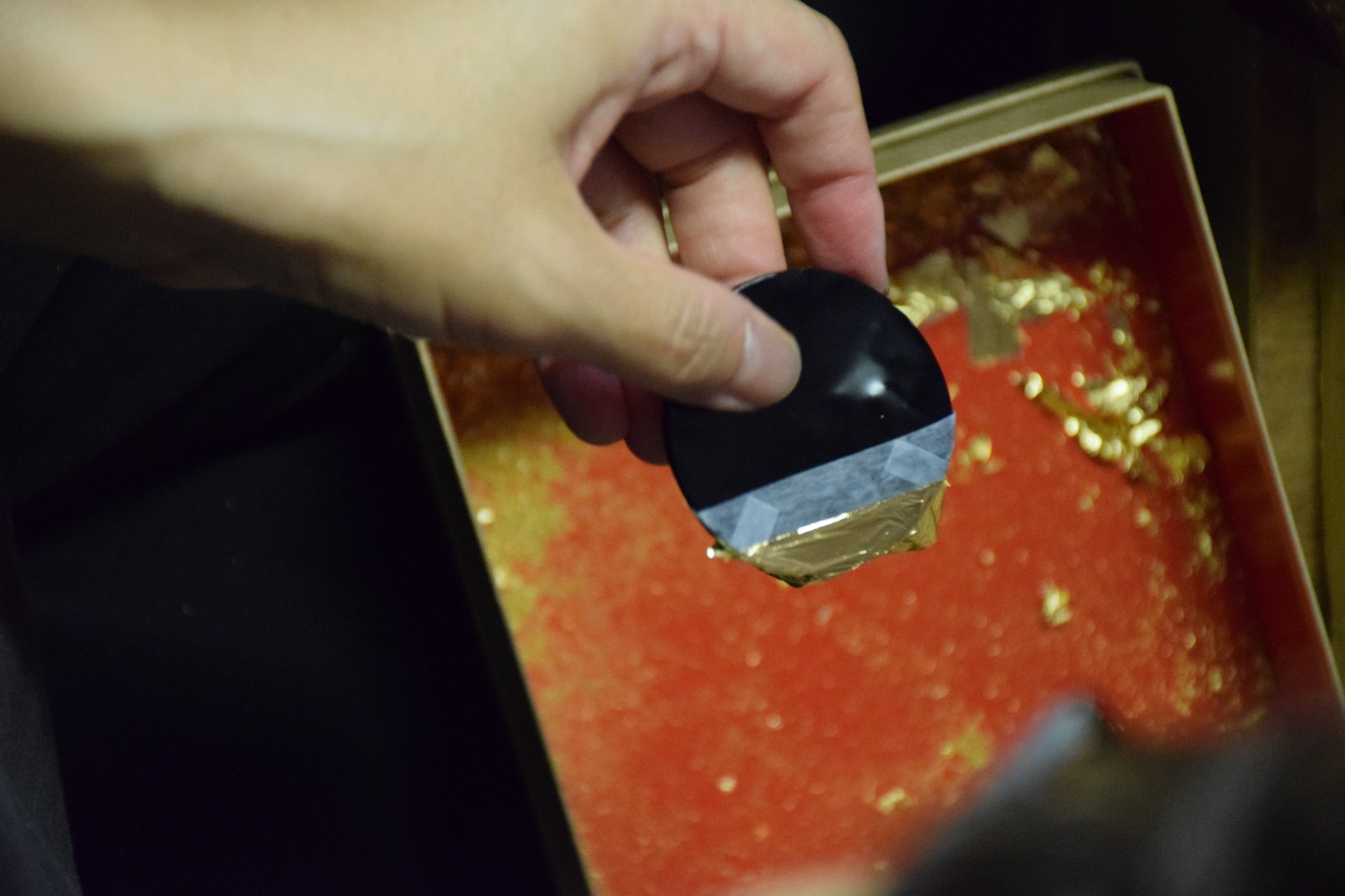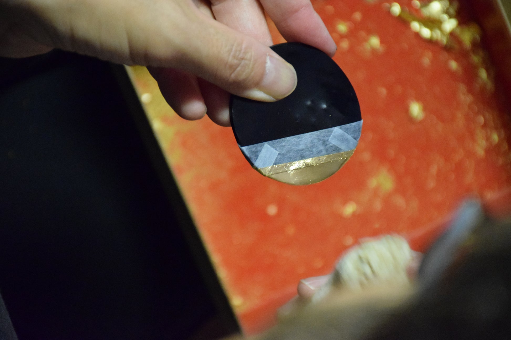 竹の節を丸く抜き漆を塗り、一部に金箔・銀箔をあしらったブローチです。