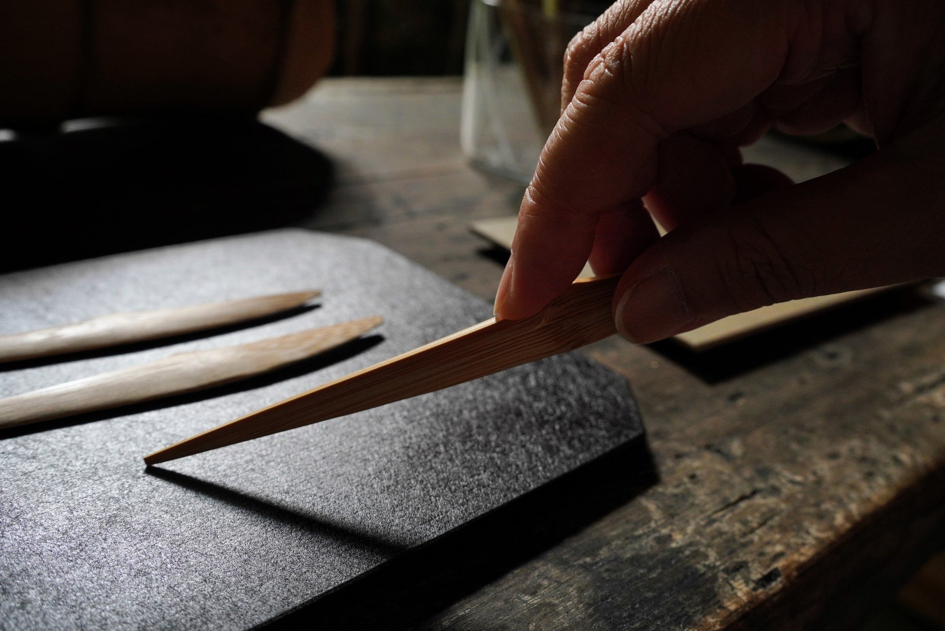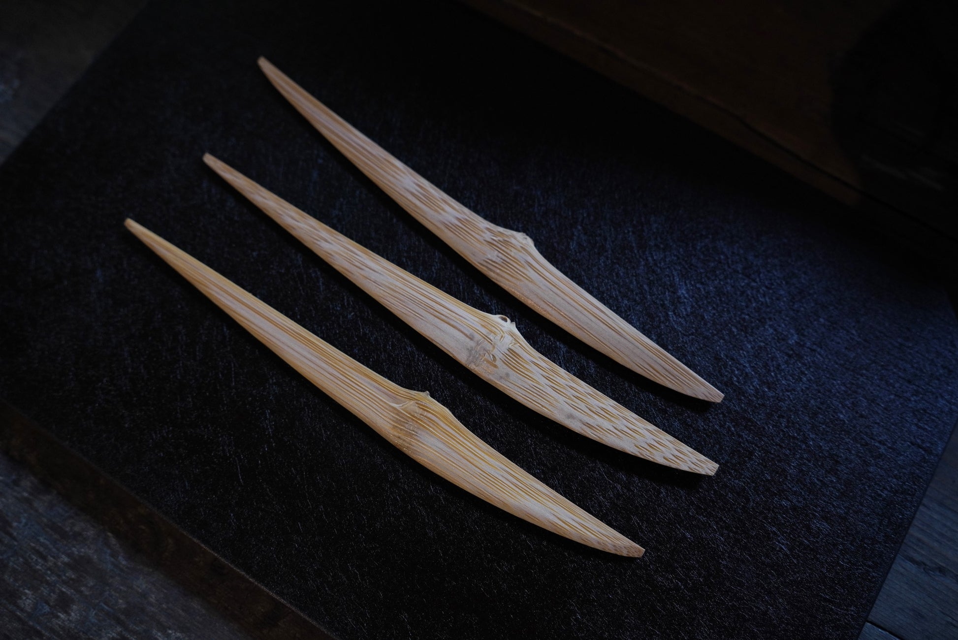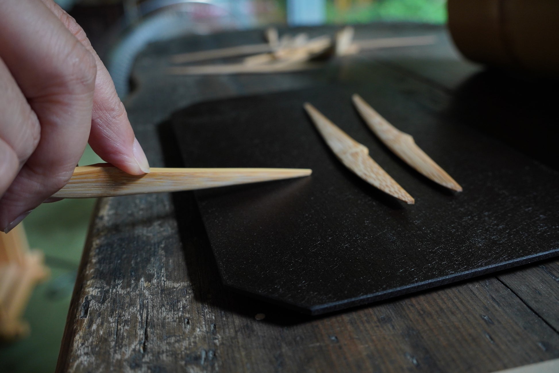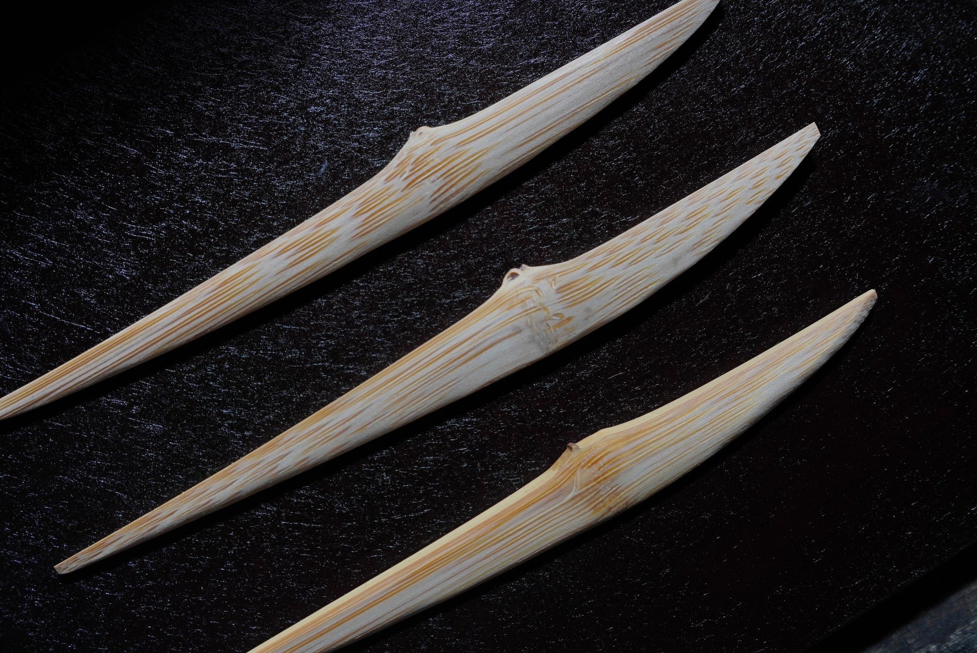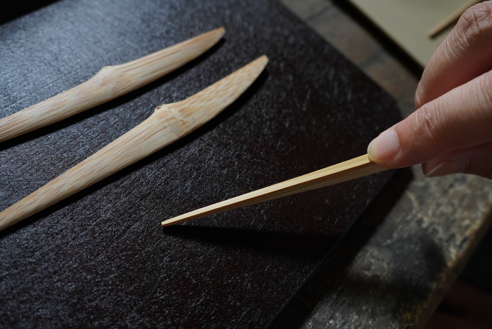 指が触れ、力のかかる上面に竹の皮を残し、丁寧に削り上げて仕上げました。