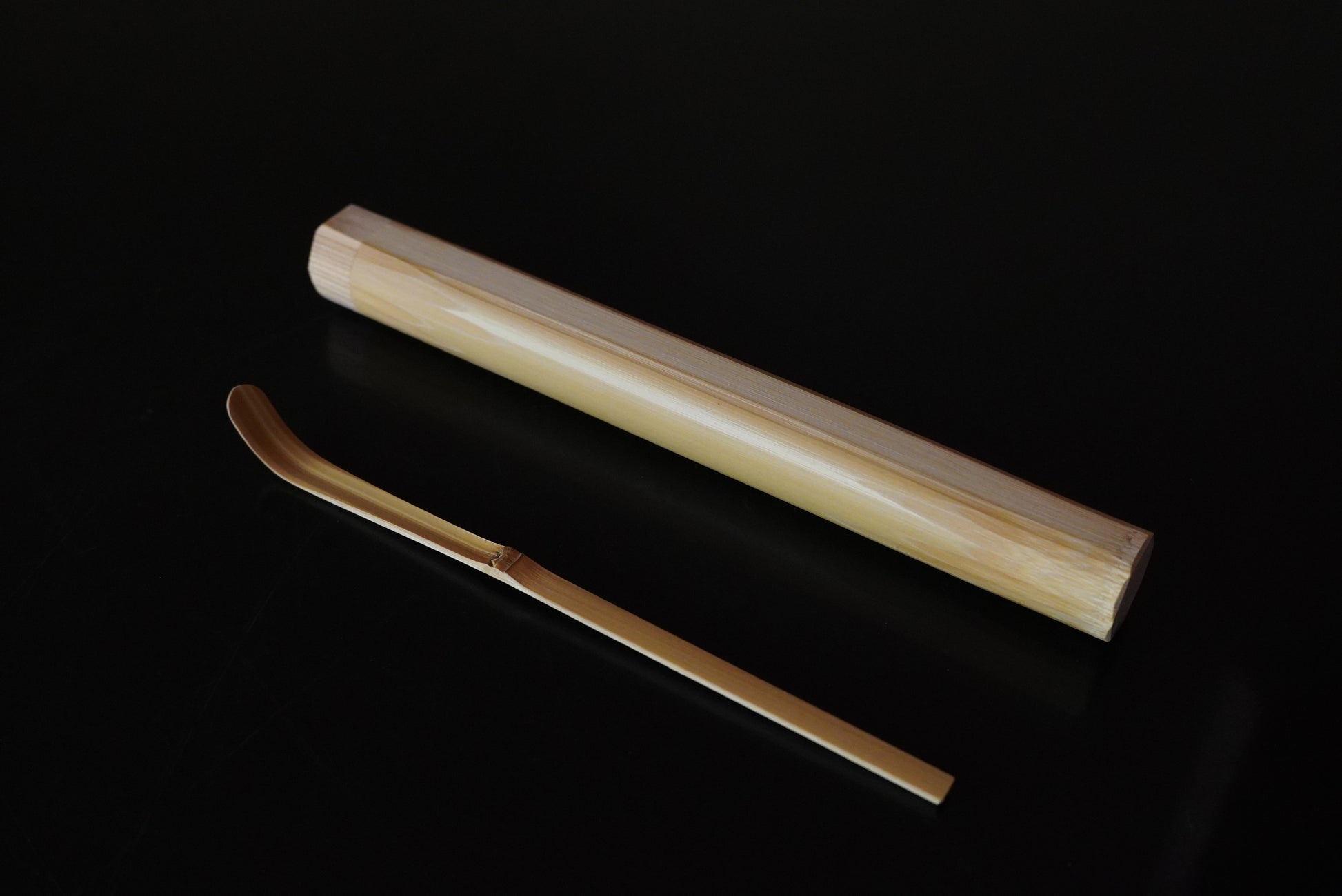 白竹を用いた茶杓用の筒です。蓋には杉を使用し、竹の形状に合わせて一本一本丁寧に加工し仕上げています。