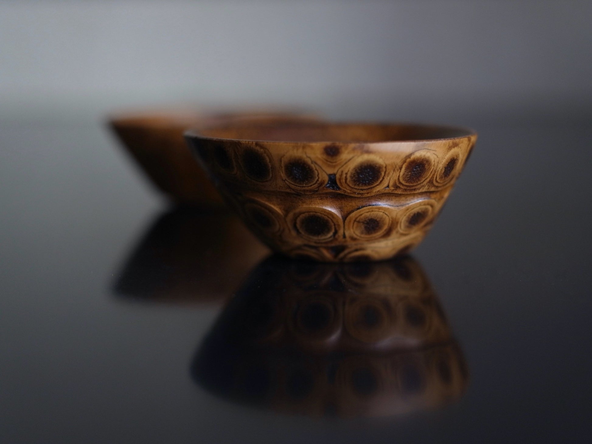 自然の形状を生かして製作した盃は大きさ、形もそれぞれに異なります。根っこの断面「竹輪紋」が数珠の様に並んだ文様はユニークな景色としてご堪能いただけます。