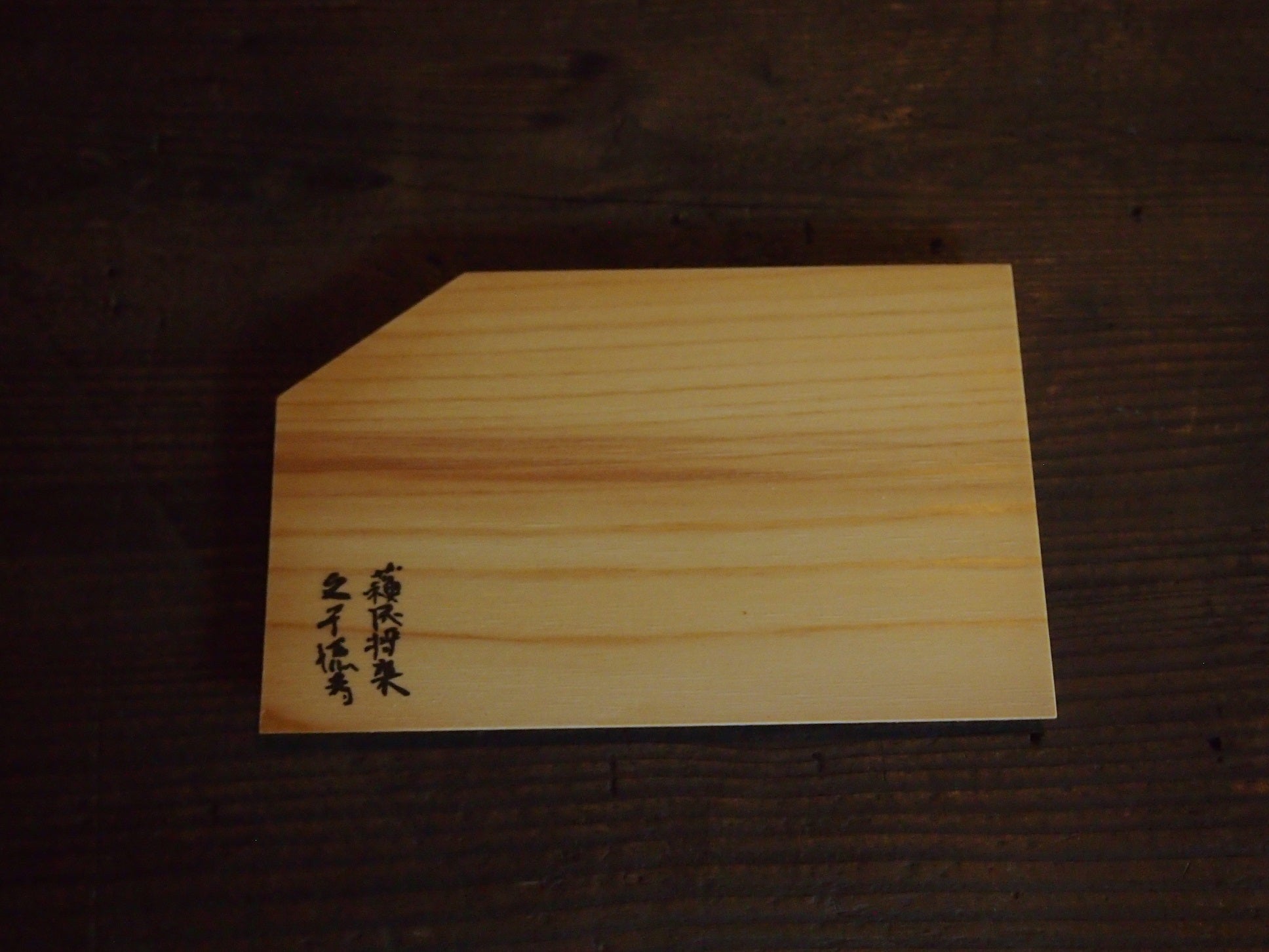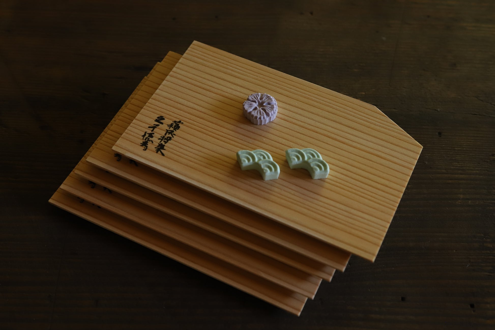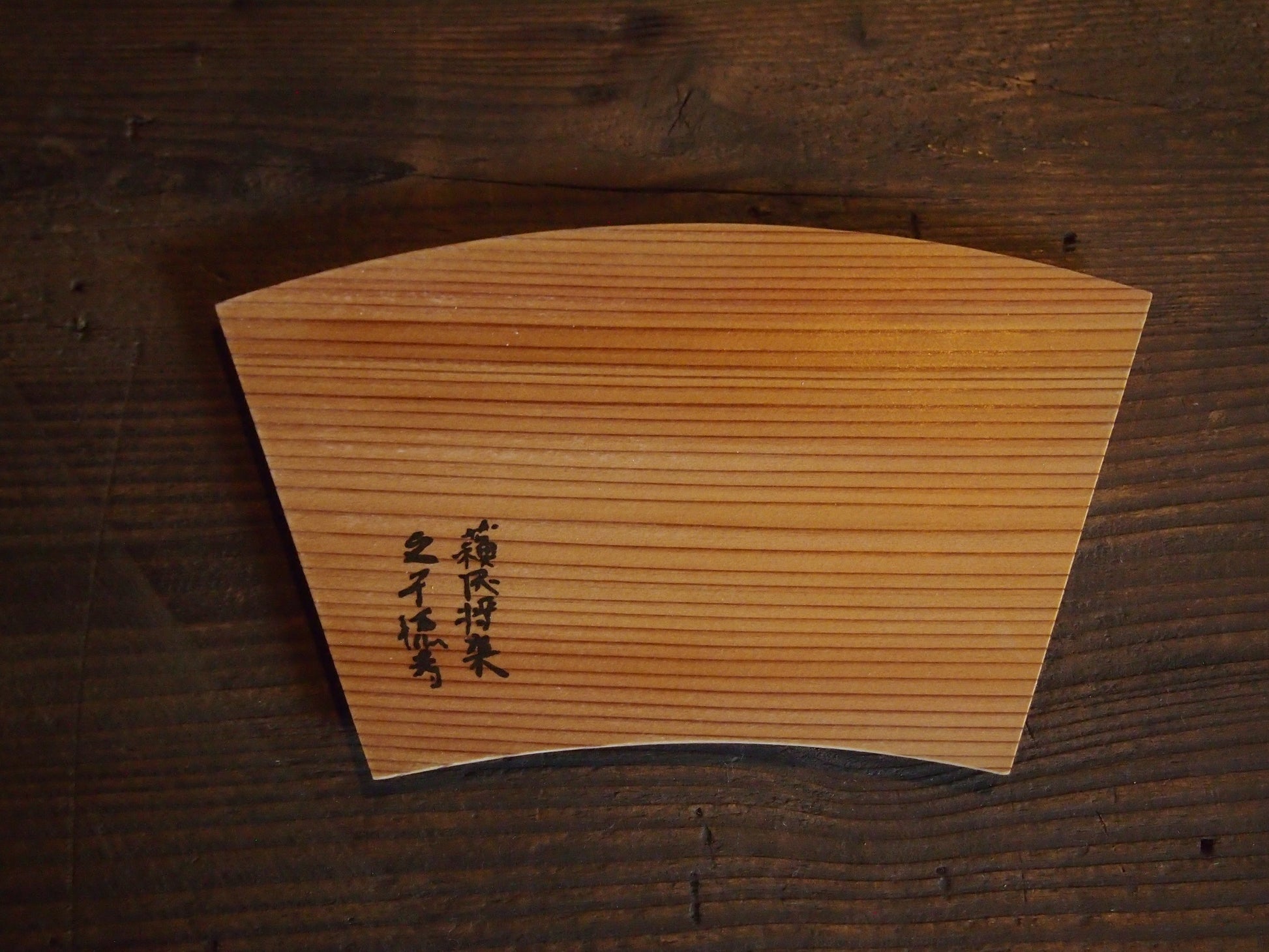 京都府長岡京市では、長岡京(784~794年)の条坊側溝から「蘇民将来子孫者」と表裏に書かれた木簡が出土しています。地元長岡京で出土した厄払いのお札にあやかり、高野竹工ではその木簡の文字の写しを配し「無病息災」の祈りを込めて、隅切型と扇型の銘々皿を作りました。