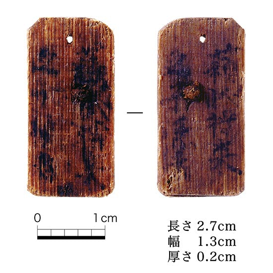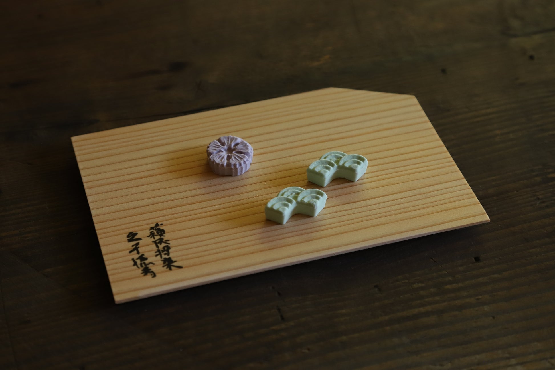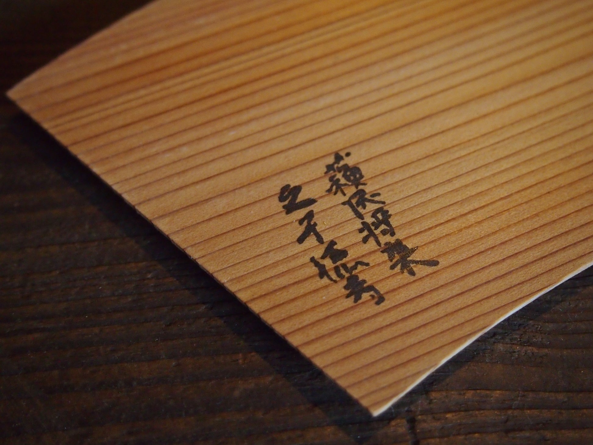 京都府長岡京市では、長岡京(784~794年)の条坊側溝から「蘇民将来子孫者」と表裏に書かれた木簡が出土しています。地元長岡京で出土した厄払いのお札にあやかり、高野竹工ではその木簡の文字の写しを配し「無病息災」の祈りを込めて、隅切型と扇型の銘々皿を作りました。